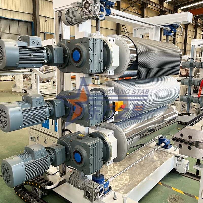 該TPE彈性體片材生產(chǎn)線使用MJ-1160衣架式鏡面流道模具和SG-1200三輥壓光機進行精確操作。模具流道經(jīng)鍍鉻拋光處理,確保熔體均勻分布。壓光機采用φ400mm鏡面輥筒,表面光潔度Ra≤0.025μm。它通過獨立溫控系統(tǒng)精確調(diào)節(jié)輥溫。